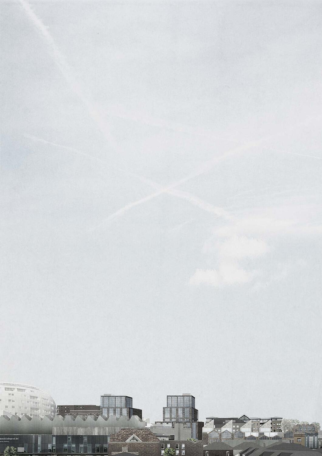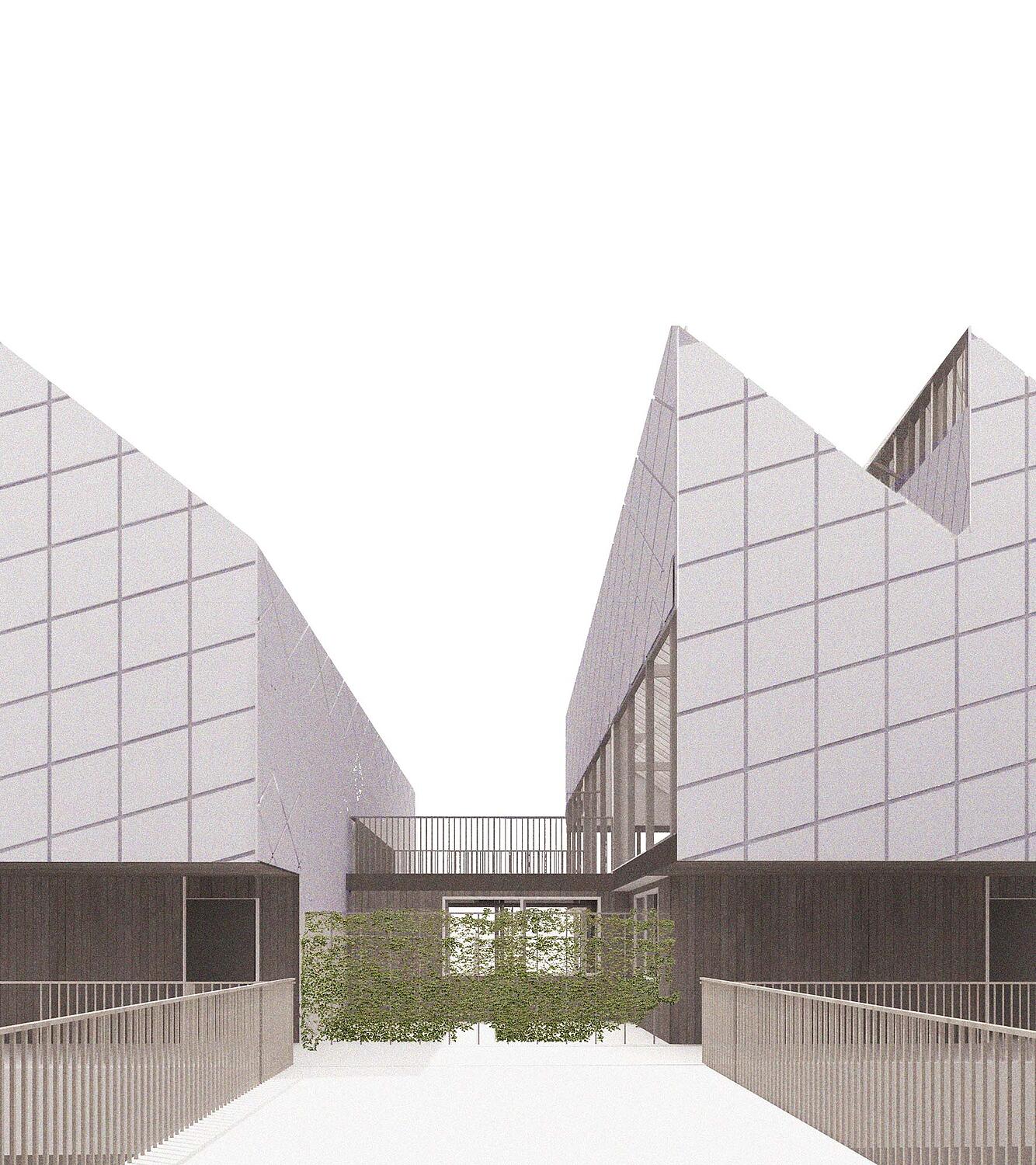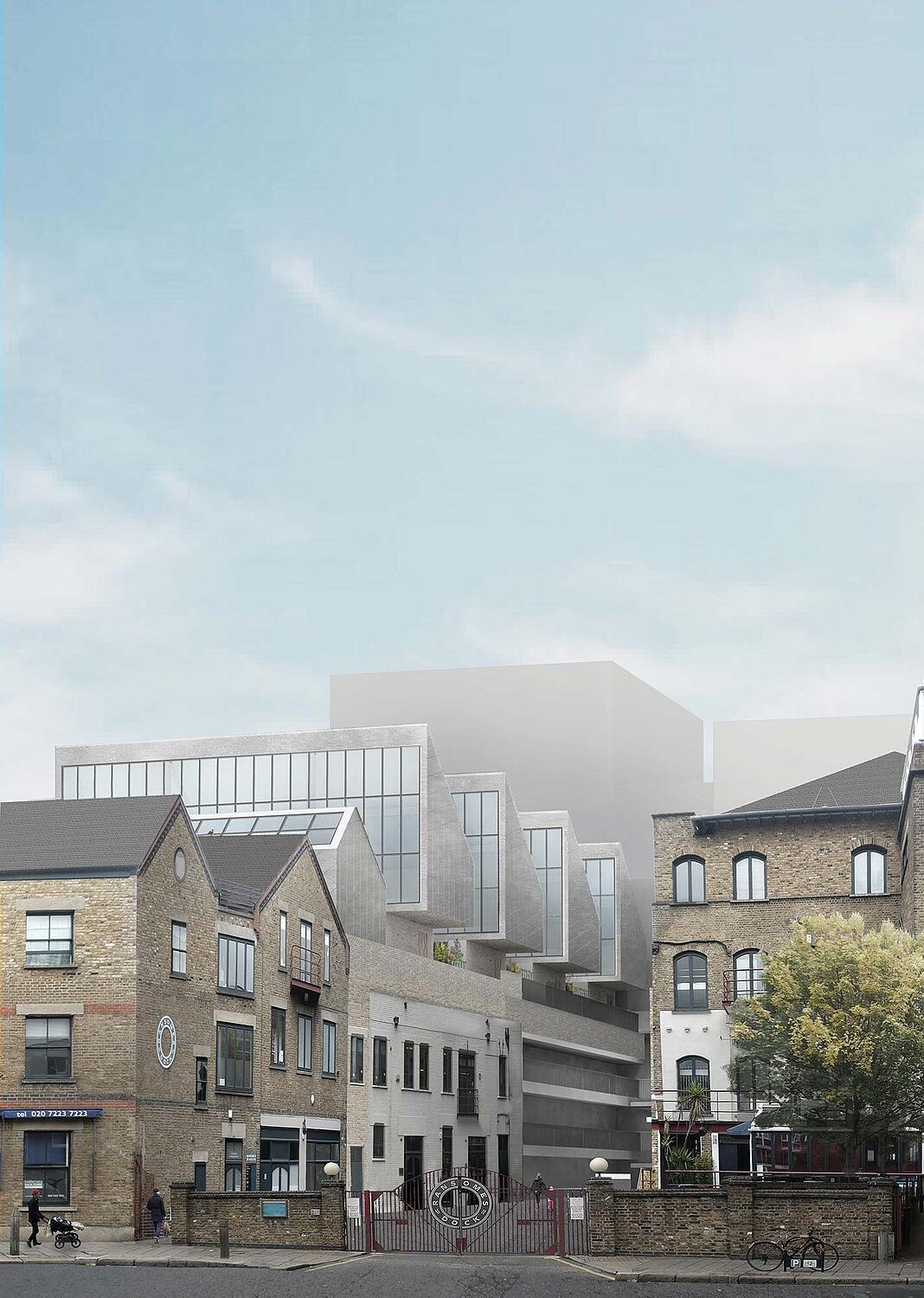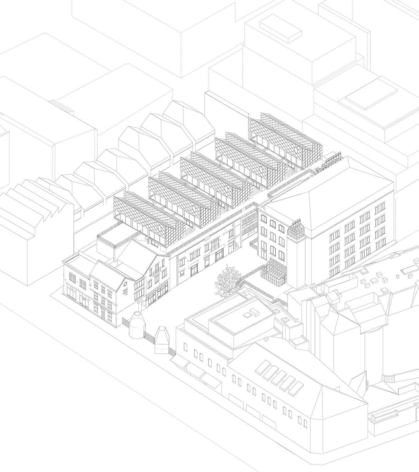 Five rooftop houses south facing with 5m high glazed windows. Living on the top floor and bedrooms beneath. The roof shape is evocative of a traditional north light form.